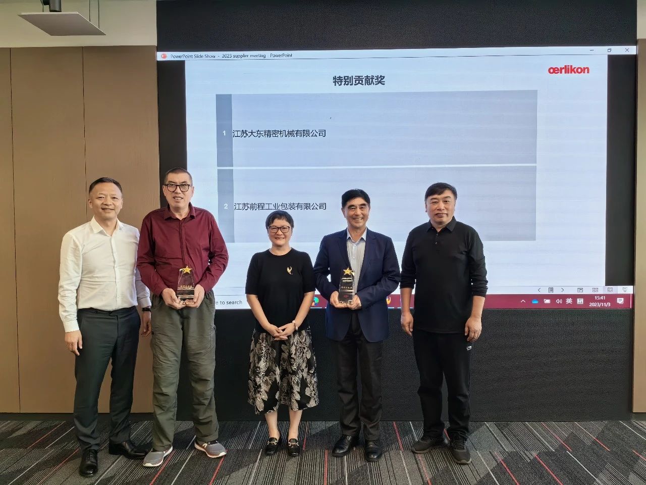 2023年11月3日,在ORK 2023供應(yīng)商會議上,客戶對前程包裝公司多年來提供高質(zhì)量的產(chǎn)品和卓越的服務(wù)支持,尤其在去年疫情期間,攻堅克難,鼎力相助,持續(xù)保障木包裝箱的及時供應(yīng)充分肯定,給予頒發(fā)“特別貢獻獎”。前程包裝董事長徐平先生出席會議并代表領(lǐng)獎。